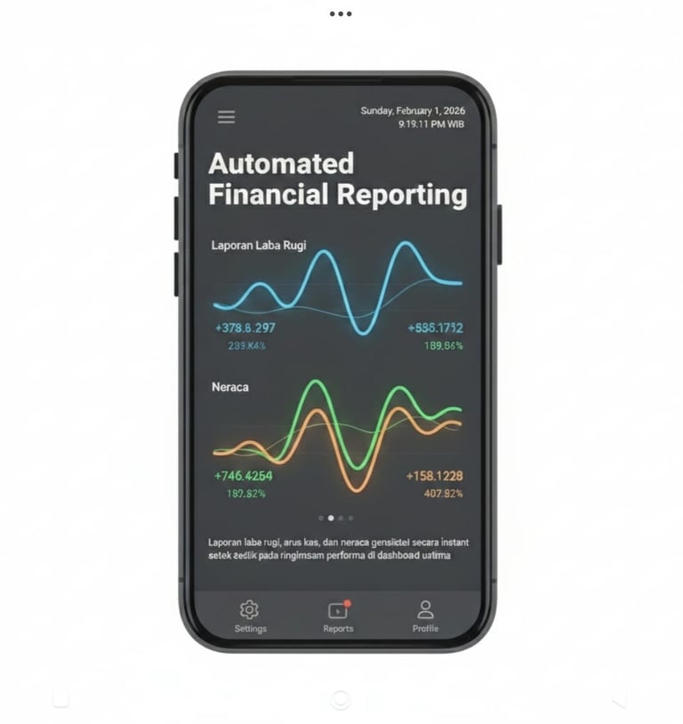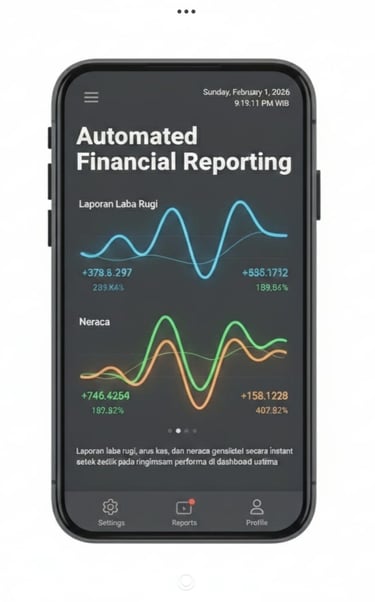 Automated Financial Reporting: Laporan laba rugi, arus kas, dan neraca dihasilkan secara instan setiap detik pada ringkasan performa di dashboard utama.